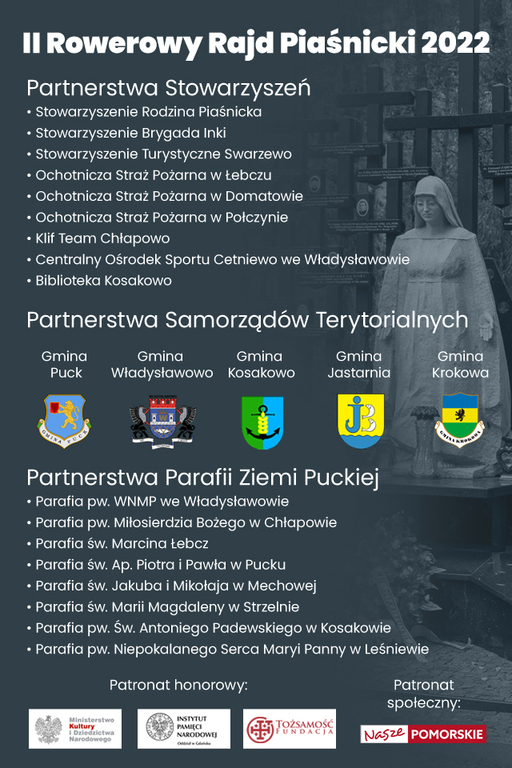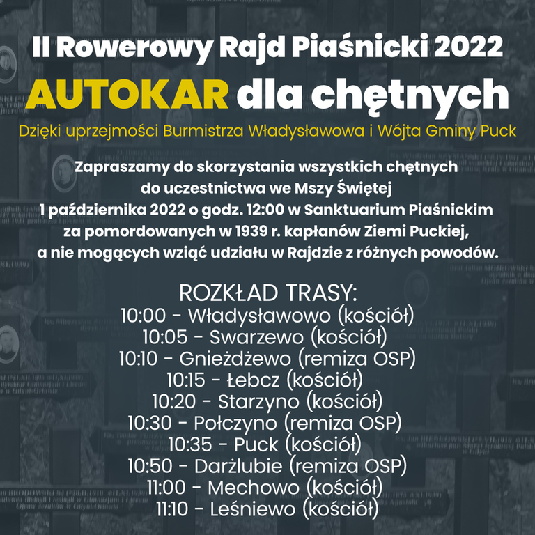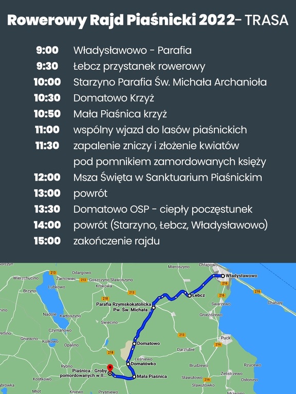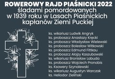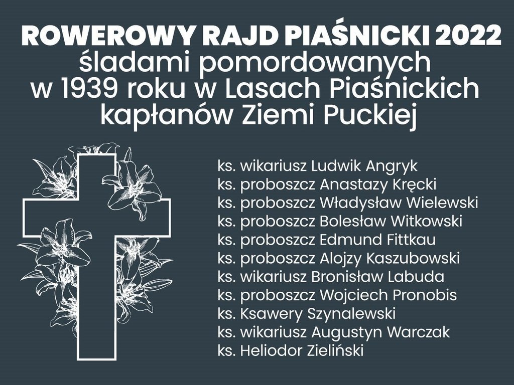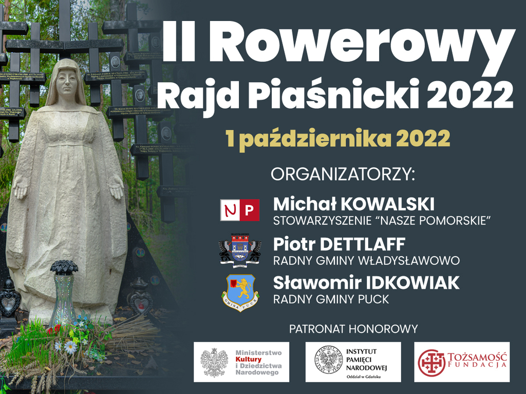 II Rowerowy Rajd Piaśnicki organizowany przez: Michała Kowalskiego Stowarzyszenie Nasze Pomorze, Piotra Dettlaffa Radnego Władysławowa oraz Sławomira Idkowiaka Radnego Gminy Puck odbędzie się w najbliższą sobotę 1 października. Celem Rajdu jest uczczenie pamięci pomordowanych w 1939 roku w lasach piaśnickich kapłanów Ziemi Puckiej. Dla osób nie mogących wziąć udziału w Rajdzie przygotowany będzie bezpłatny transport autokarem w obie strony.