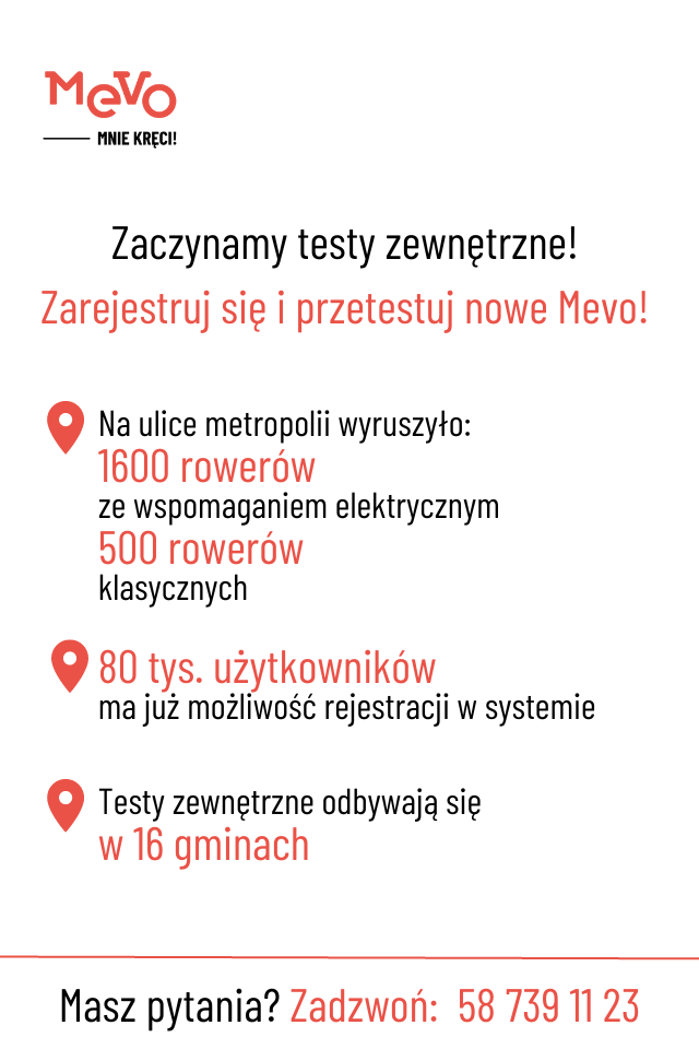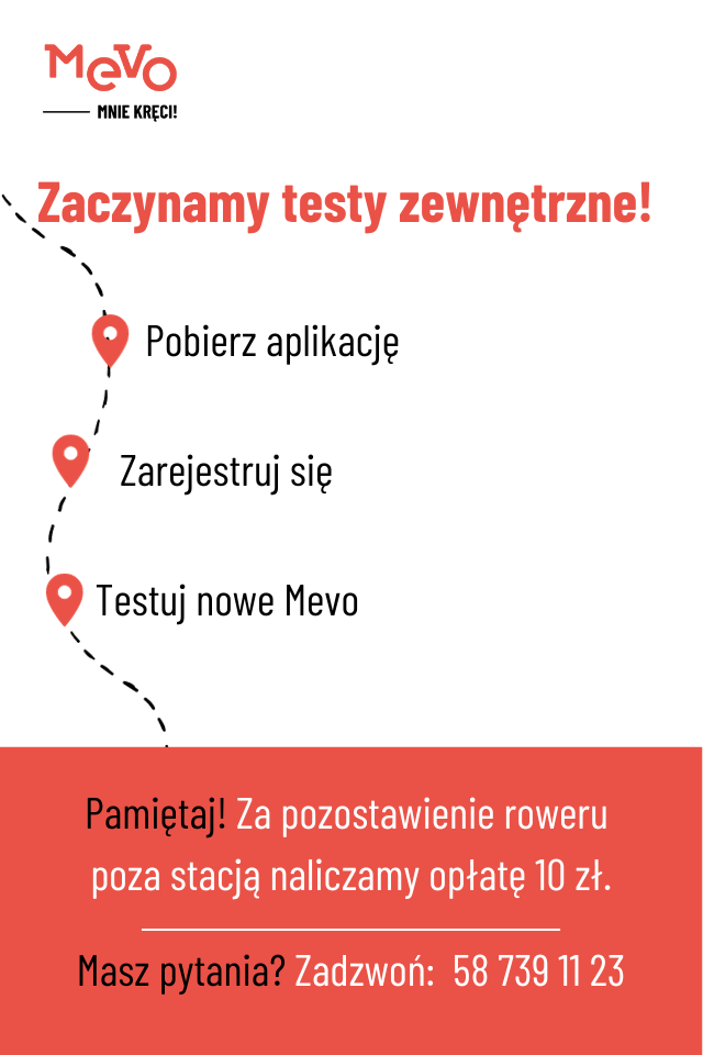 – Rozruch zewnętrzny to kolejny etap testowy funkcjonowania Systemu Roweru Metropolitalnego. Służy sprawdzeniu jego działania na większej grupie użytkowników, przy wzmożonym obciążeniu aplikacji mobilnej i systemu do raportowania. To również test dla hiszpańskiego Operatora, jak poradzi sobie z relokacją rowerów i wymianą baterii. Zachęcam wszystkich do zgłaszania wszelkich nieprawidłowości do Centrum Kontaktu (58 739 11 23), w ciągu kilku dni na naszych stronach dostępna będzie też ankieta umożliwiająca zgłaszanie uwag bezpośrednio do OMGGS – mówi Dagmara Kleczewska, kierownik projektu Mevo 2.0.