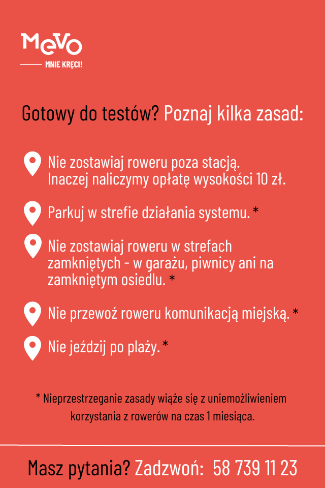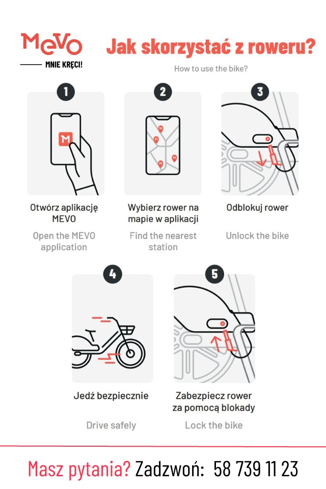 W przypadku problemów z aplikacją, wypożyczeniem czy zwrotem roweru należy zgłosić się do Centrum Kontaktu, nr tel. 58 739 11 23. Infolinia jest czynna codziennie w godz. 7- 21. Użytkownicy mogą kierować uwagi również na adres e-mail: kontakt@rowermevo.pl.