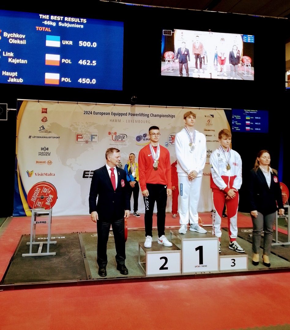 Zwyciężył także w poszczególnych bojach zdobywając trzy złote medale następującymi wynikami: przysiady – 290,kg, wyciskanie sztangi leżąc – 230,0 kg – rekord Polski Juniorów do 18 lat, oraz w martwym ciągu 265,0 kg. Tytuł V-ce Mistrza Europy zdobył debiutujący na międzynarodowych pomostach 17 letni Kajetan Link, który w kat. do 66,0 kg uzyskał 462,5 kg. W wyciskaniu leżąc zdobył medal złoty wynikiem 115,0 kg, srebrny medal zdobył w przysiadach – 170,0 kg, a w martwym ciągu medal brązowy wynikiem 177,5 kg. Kajetan poprawił wszystkie swoje dotychczasowe rekordy o 69 kg.