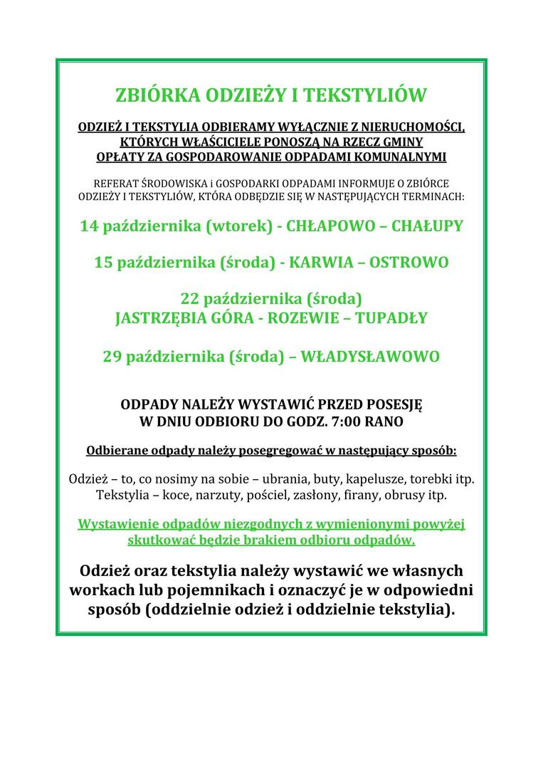 Informujemy, że 14, 15, 22, oraz 29 października odbędzie się zbiórka odzieży i tekstyliów. Będą one odbierane tylko i wyłącznie z nieruchomości, których właściciele uiszczają na rzecz gminy opłaty za gospodarowanie odpadami komunalnymi.
