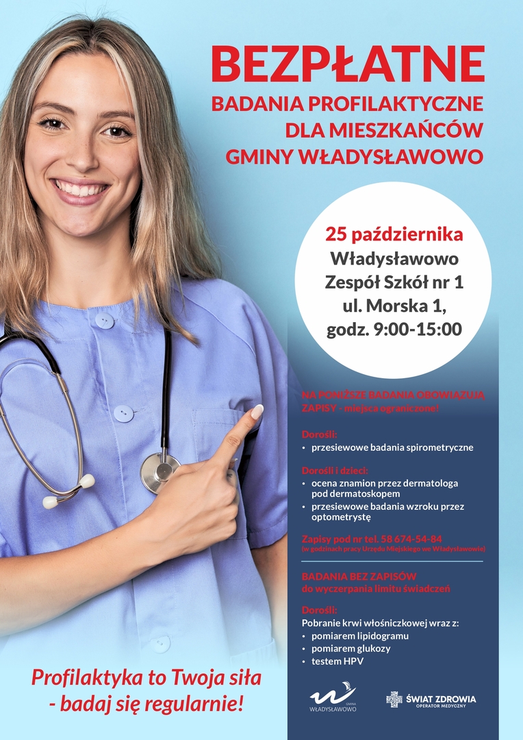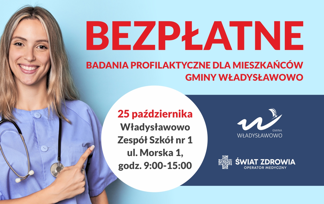 Zdrowie naszych mieszkańców jest dla nas priorytetem, w związku z tym wszystkich chętnych zapraszamy 25 października w godz. 9:00-15:00 do Zespołu Szkół nr 1 we Władysławowie, na darmowe badania profilaktyczne.