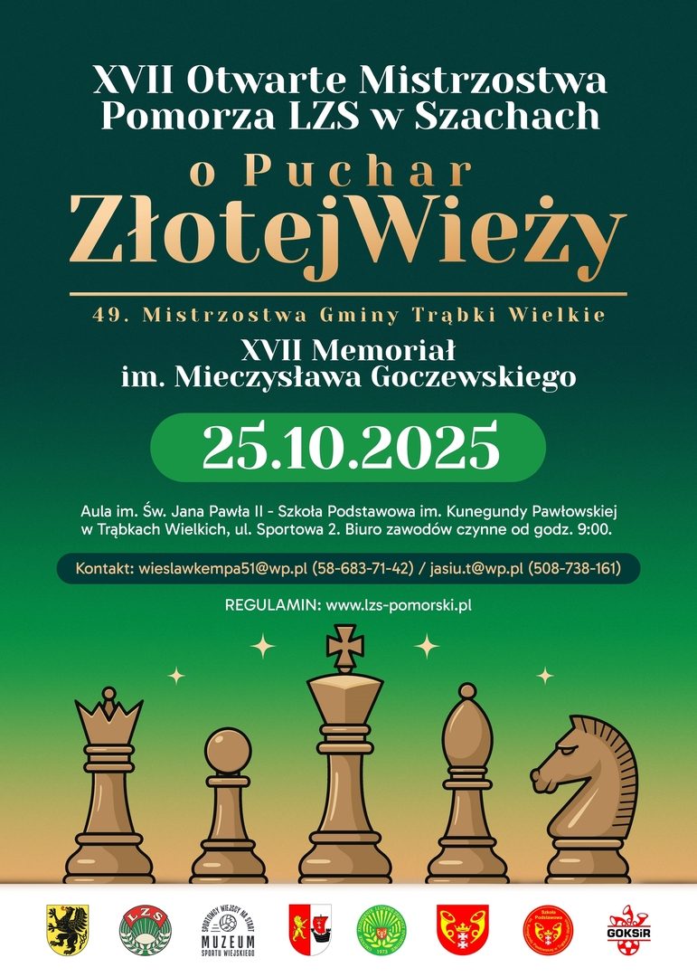 Zapraszamy na XVII Otwarte Indywidualne Mistrzostwa Województwa Pomorskiego LZS w Szachach o "Puchar Złotej Wieży", XVII Memoriał Szchowy im. Mieczysława Goczewskiego, XLIX Mistrzostwa Gmint Trąbki Wielkie.
