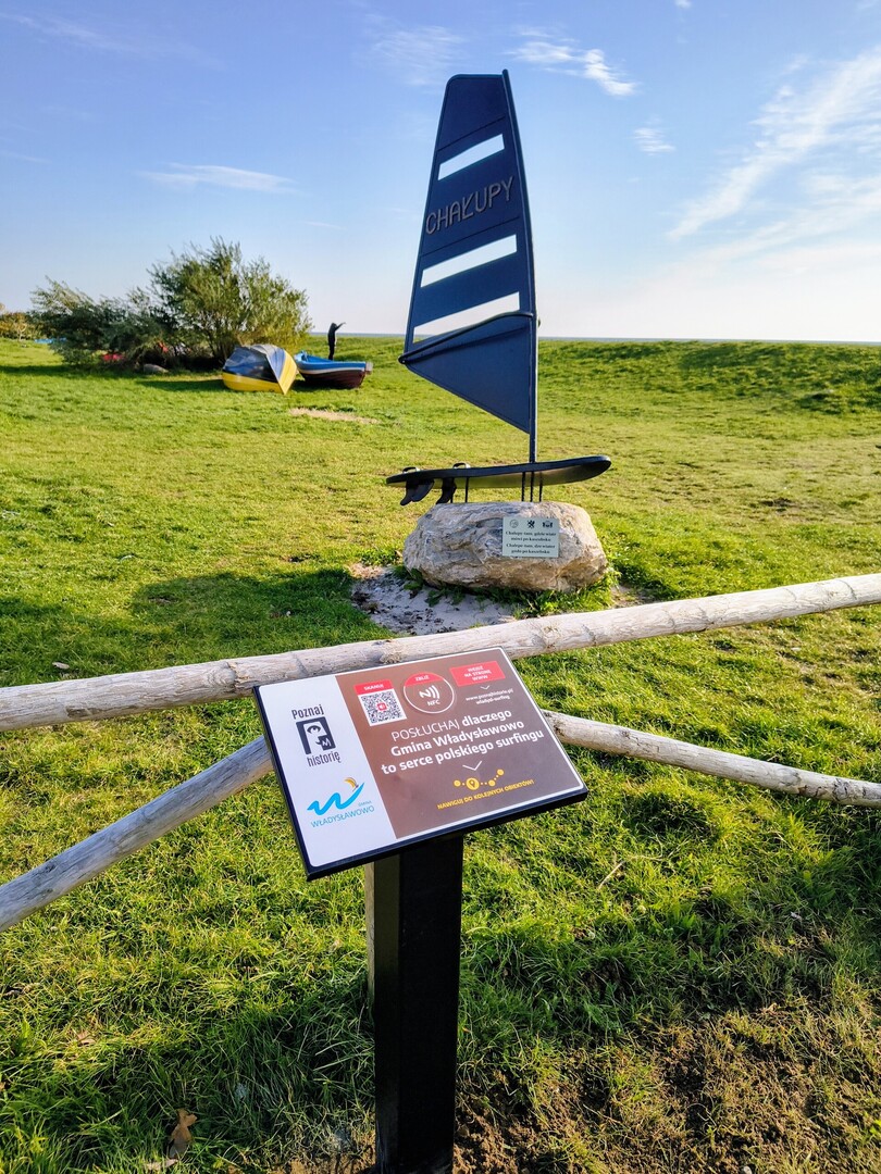 Tuż obok znalazła się kolejna tabliczka – część projektu „Poznaj Historię” – zachęcająca, by „Posłuchać, dlaczego Gmina Władysławowo to serce polskiego surfingu”. Wystarczy zeskanować kod QR, by usłyszeć dźwięki i opowieści o ludziach, którzy nadali wiatrowi imię wolności.