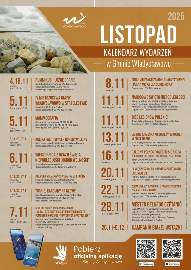 Przedstawiamy kalendarz planowanych wydarzeń w listopadzie. Prosimy wszystkich organizatorów mniejszych lub większych niekomercyjnych wydarzeń w naszej gminie o współtworzenie takiego kalendarza i przesyłanie nam informacji na adres: promocja@wladyslawowo.pl