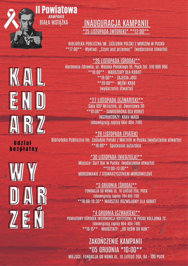 W ramach kampanii na terenie powiatu puckiego zaplanowano szereg wydarzeń edukacyjnych, profilaktycznych i symbolicznych. Wśród nich znajdą się m.in. uroczysta inauguracja kampanii, warsztaty, spotkania oraz zajęcia skierowane do różnych grup odbiorców.