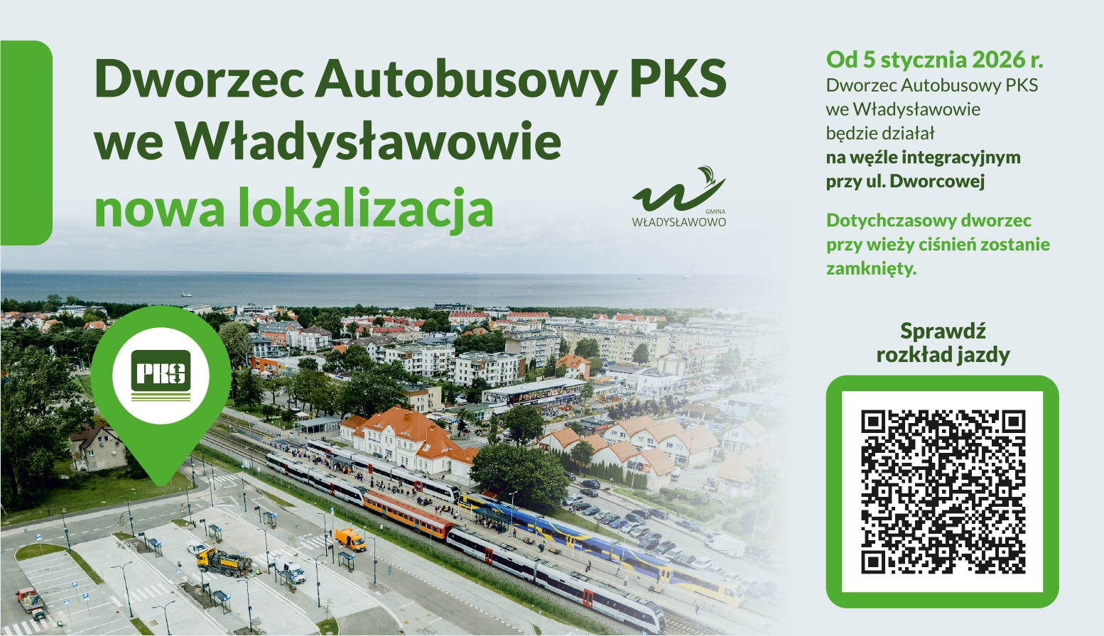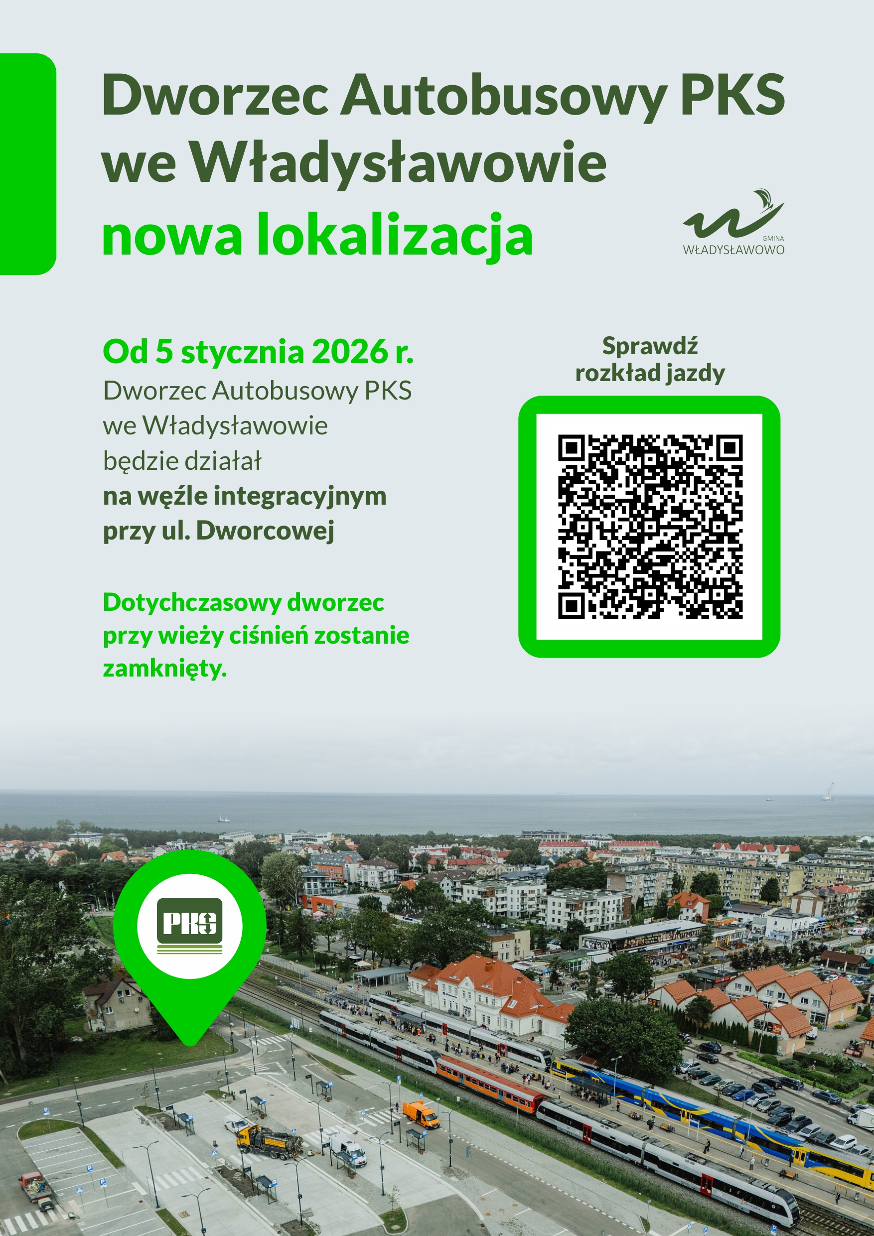 Informujemy, że Dworzec Autobusowy PKS we Władysławowie od 5 stycznia 2026 roku będzie funkcjonował na nowym węźle integracyjnym przy ul. Dworcowej.