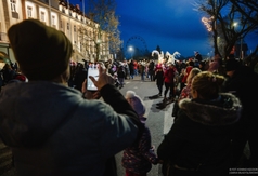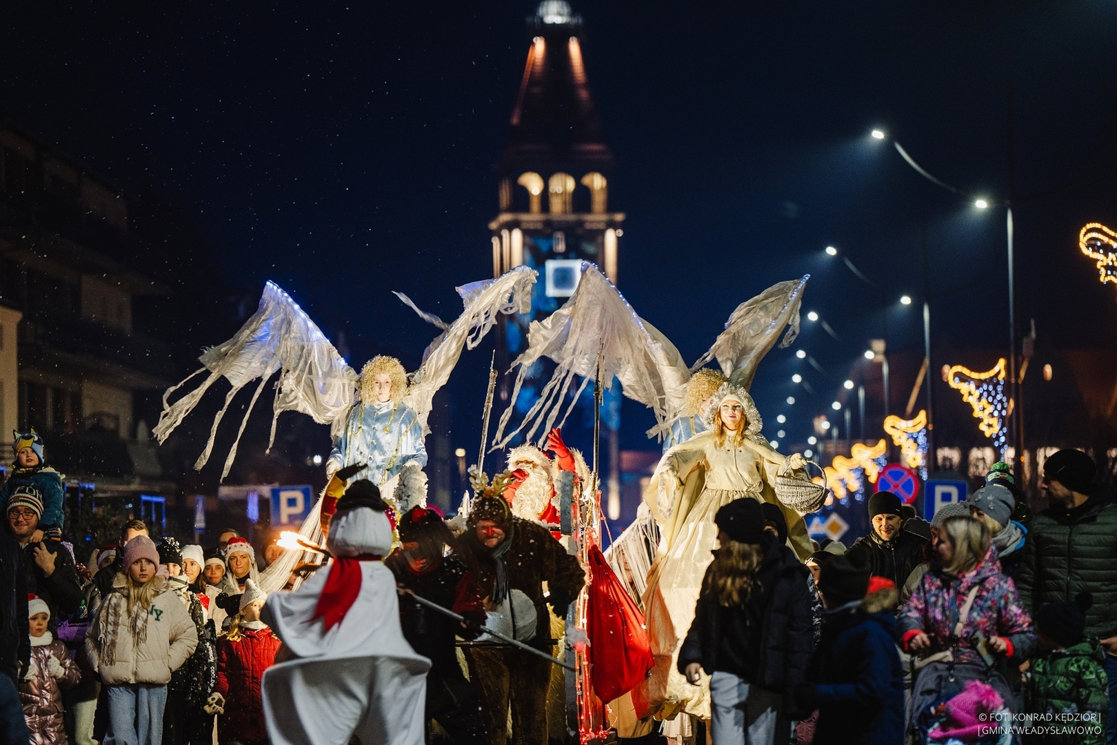 Kiedy dzień chylił się już ku końcowi, zgromadzeni pod Urzędem Miejskim mieszkańcy wraz ze świątecznymi postaciami, wyruszyli w mikołajkową podróż ulicami miasta. Ich wędrówka miała trzy najważniejsze cele. Pierwszy z nich to włączenie lampek na miejskiej choince, któremu sekundował Burmistrz Władysławowa Roman Kużel wraz z Dyrektor Miejskiej i Powiatowej Biblioteki Publicznej Bogumiłą Ceynową - Kaszprzyk, a jednocześnie główną organizatorką całego przedsięwzięcia. To wszystko odbyło się przy akompaniamencie Miejsko-Parafialnej Orkiestry Dętej Władysławowa oraz przy dźwięcznym wielogłosie chóru „Stella Maris”. Ta wyjątkowa oprawa muzyczna dodała magii temu wydarzeniu. Kolejnym celem było dotarcie na Targowisko Miejskie przy ulicy Morskiej, na którym już od samego rana, o świąteczne zapachy jak i atmosferę, zadbało Stowarzyszenie Zdobywać świat od najmłodszych lat wraz z kadrą, rodzicami i dziećmi z Przedszkola nr 1 oraz rzemieślnikami, rękodzielnikami i wystawcami, którzy prezentowali swoje piękne i smakowite produkty w targowiskowych boksach. Ktokolwiek nie dotarł wcześniej czy później do tego miejsca, wychodził albo z pełnym brzuchem albo z torbami wypełnionymi upominkami.