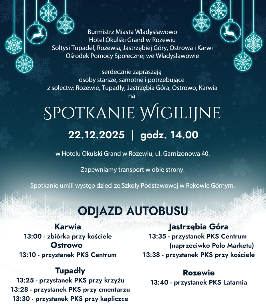 Grudzień to czas radosnego oczekiwania, ale dla wielu osób to także najtrudniejszy moment w roku. Gdy ulice rozświetlają świąteczne iluminacje, w oknach widać radosny czas spędzany w gronie rodzinnym - cisza we własnych czterech ścianach staje się wyjątkowo dotkliwa. Dlatego Burmistrz Władysławowa, Hotel Okulski Grand w Rozewiu, Sołtysi Tupadeł, Rozewia, Jastrzębiej Góry, Ostrowa i Karwi oraz Ośrodek Pomocy Społecznej we Władysławowie serdeczne zapraszają osoby starsze, samotne i potrzebujące na Spotkanie Wigilijne. To wydarzenie udowadnia, że największym prezentem jest obecność drugiego człowieka.