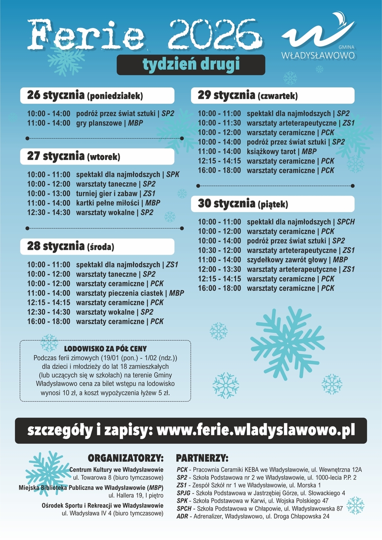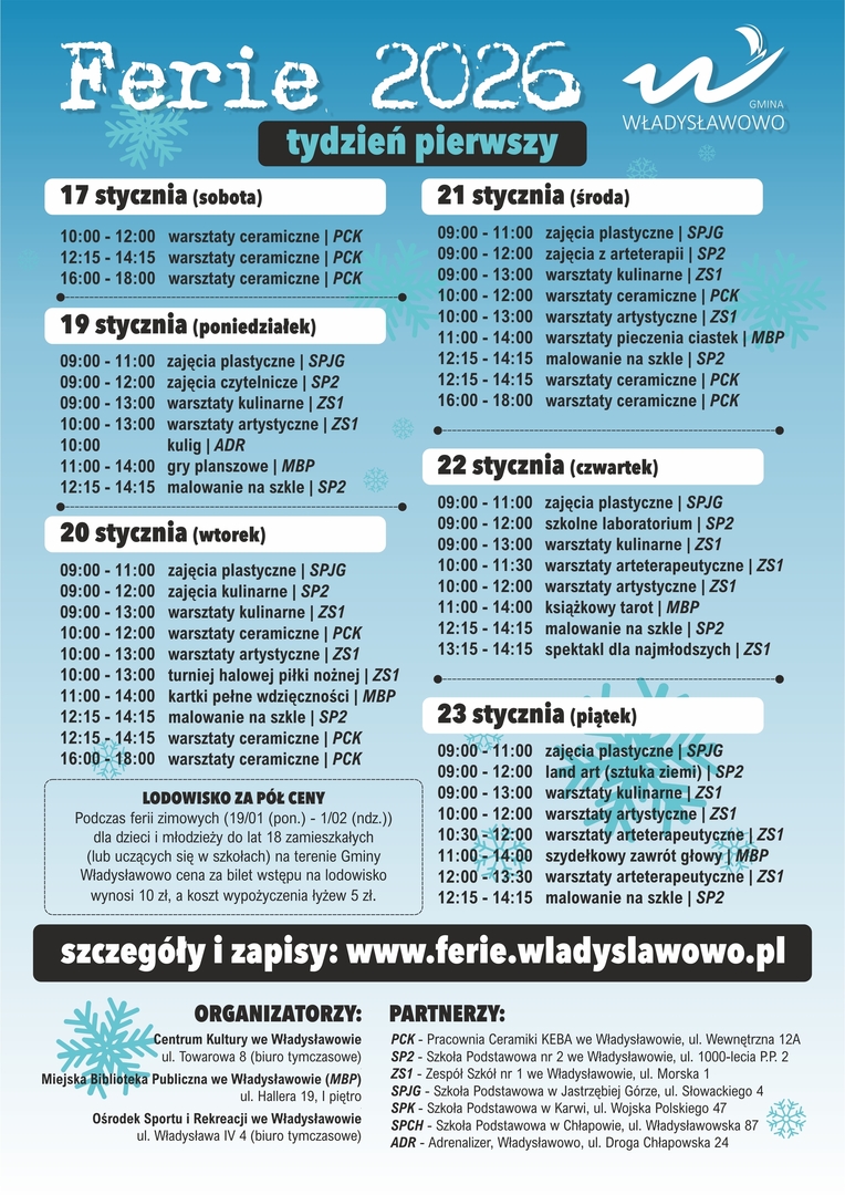 Serdecznie zapraszamy do korzystania z oferty aktywności na oba tygodnie ferii zimowych 2026 w Gminie Władysławowo.