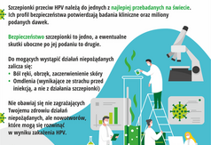 Szczepionki przeciw HPV są bezpieczne i dobrze tolerowane. Występuje niewiele działań niepożądanych, tj. ból w miejscu wstrzyknięcia, zaczerwienienie, obrzęk, zmęczenie, ból głowy i mięśni. Bezpieczeństwo szczepionek przeciw HPV jest dokładnie monitorowane od 2006 roku, kiedy wprowadzono na rynek pierwszą szczepionkę. Na świecie podano już kilkaset milionów dawek szczepionek przeciw HPV. Mocne dowody naukowe potwierdzają bardzo dobry profil bezpieczeństwa szczepionek przeciw HPV. Badań jest tak dużo, że można wręcz powiedzieć, że szczepionki przeciw HPV należą do najwnikliwiej przebadanych pod względem bezpieczeństwa preparatów szczepionkowych.