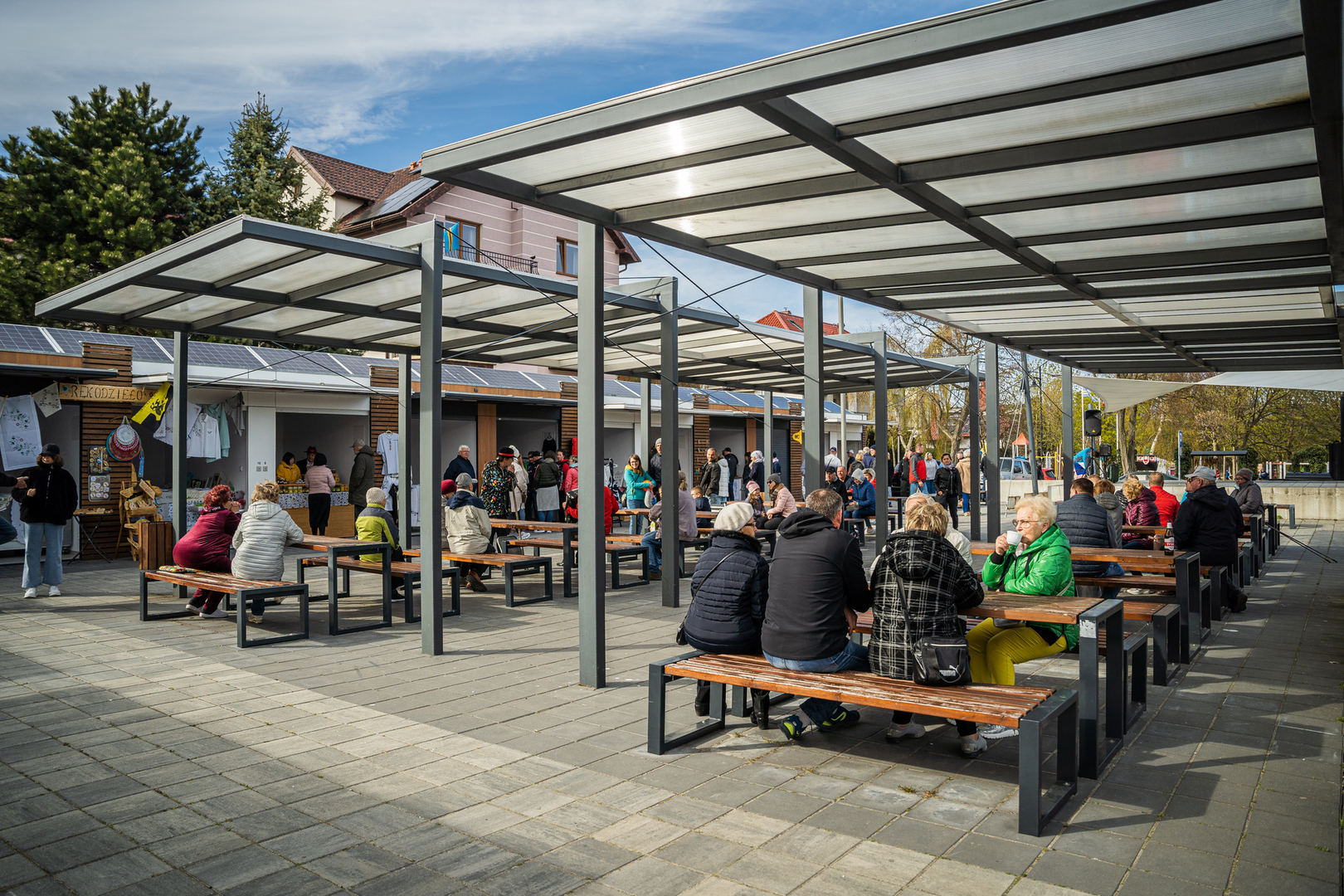 - 13 stanowisk o powierzchni 7,39m2 każde, przeznaczonych dla osób prowadzących działalność promocyjną produktów lokalnych i regionalnych oraz produktów związanych z rzemiosłem,