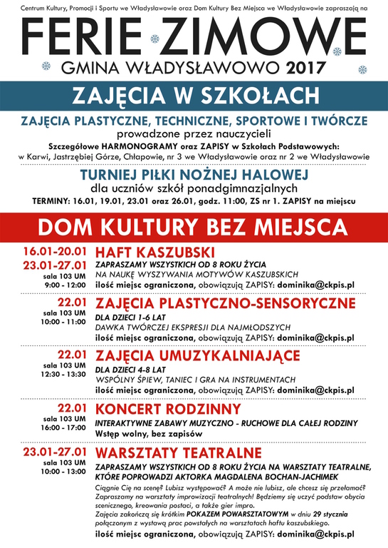 Centrum Kultury, Promocji i Sportu we Władysławowie oraz Dom Kultury Bez Miejsca we Władysławowie zapraszają na Ferie Zimowe 2017 w Gminie Władysławowo.