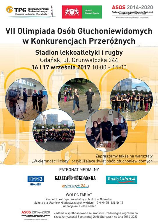 W dniach 15 - 17 września 2017 roku Pomorska Jednostka TPG organizuje VII Olimpiadę Osób Głuchoniewidomych w Konkurencjach Przeróżnych. PJ Towarzystwa Pomocy Głuchoniewidomym otacza opieką osoby z jednoczesną dysfunkcją wzroku i słuchu. Pomagają zarówno w codziennym funkcjonowaniu, ale także w osobistej i zawodowej samorealizacji. Wspólnie z osobami głuchoniewidomymi realizują te cele organizując różnego typu imprezy kulturalne, społeczne, integracyjne.