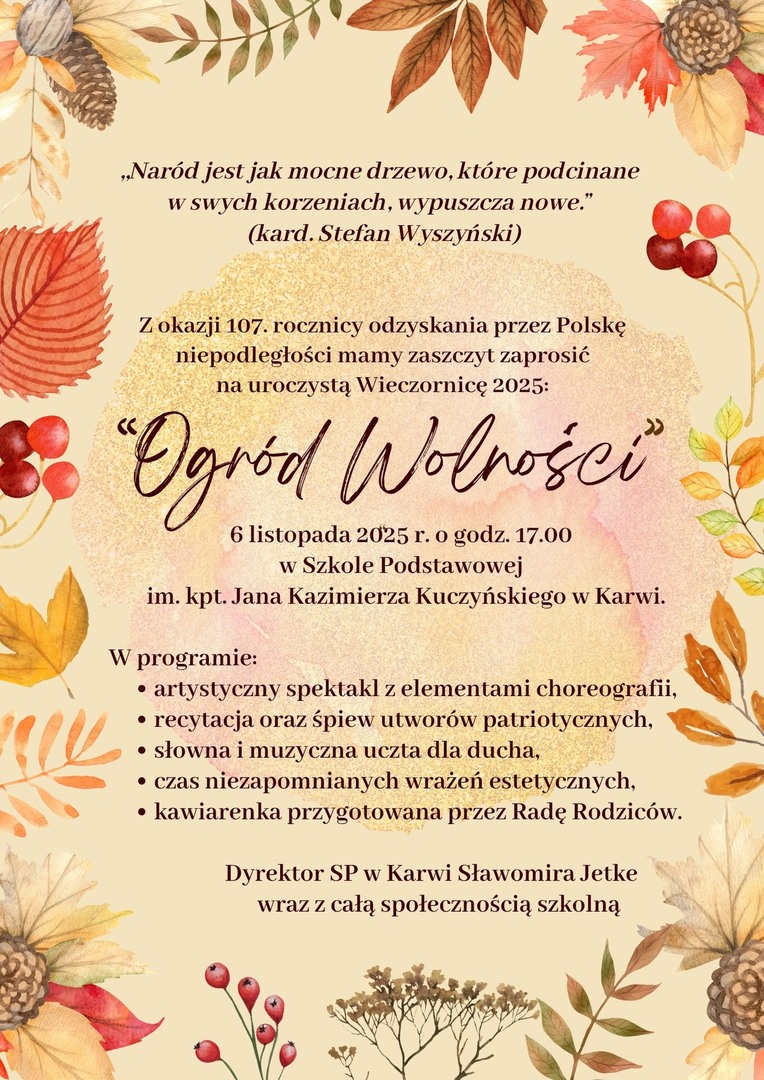 Z okazji 107. rocznicy odzyskania przez Polskę Niepodległości, zapraszamy na uroczystą wieczornicę 2025: "Ogród Wolności".