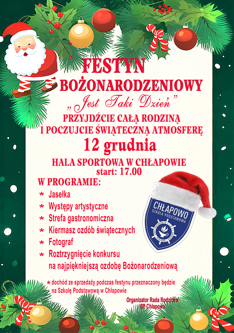 Rada Rodziców Szkoły Podstawowej w Chlapowie zaprasza na Festyn Bożonarodzeniowy "Jest taki dzień" . Przyjdzcie całą rodziną i poczujcie świąteczną atmosferę.